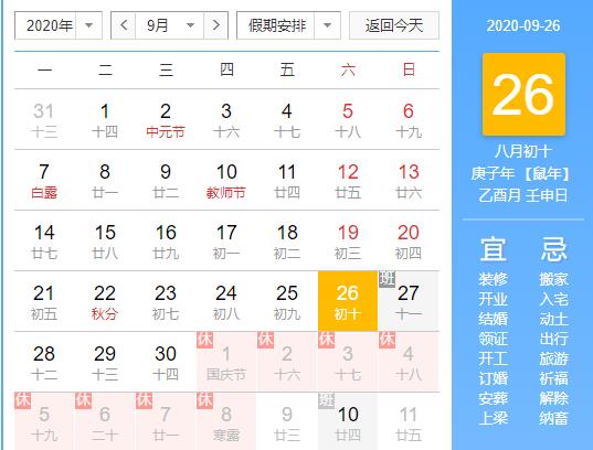 放假時間:2020年10月1日至10月8日放假,共8天。9月27日(星期日)上班。
